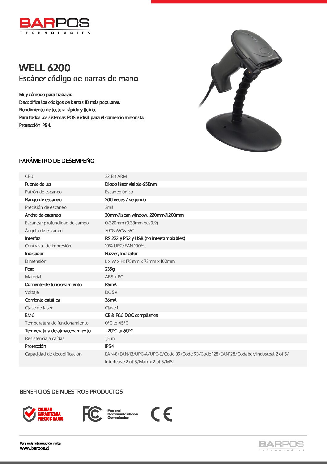 Lector Laser Barpos Well 6200 1D USB con Pedestal