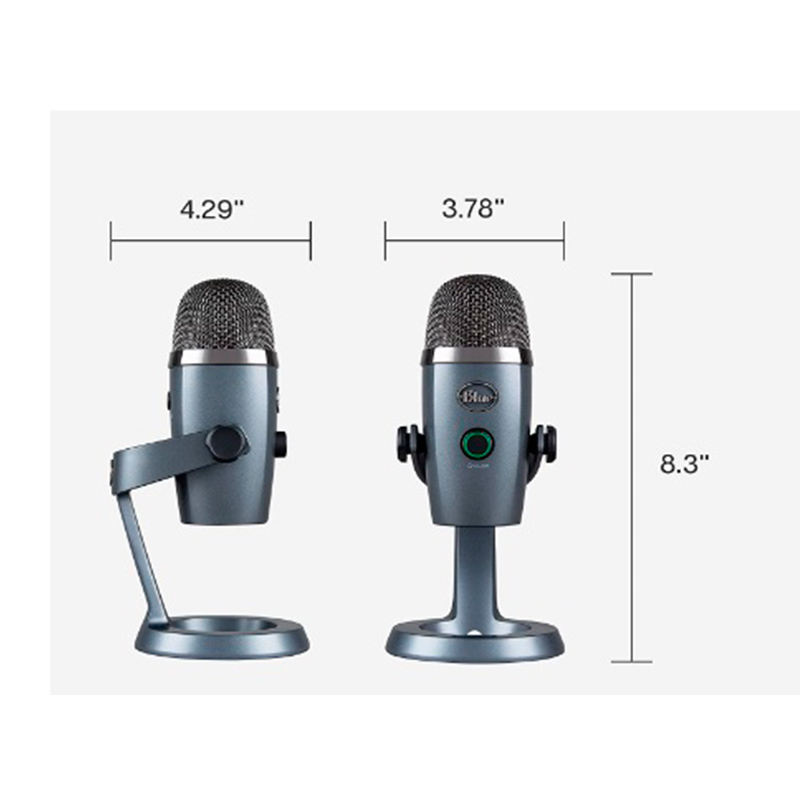 - Dimensiones (micrófono con soporte): L: 4.29 "(10.9cm) W: 3.78" (9.6cm) H: 8.31 "(21.1cm).